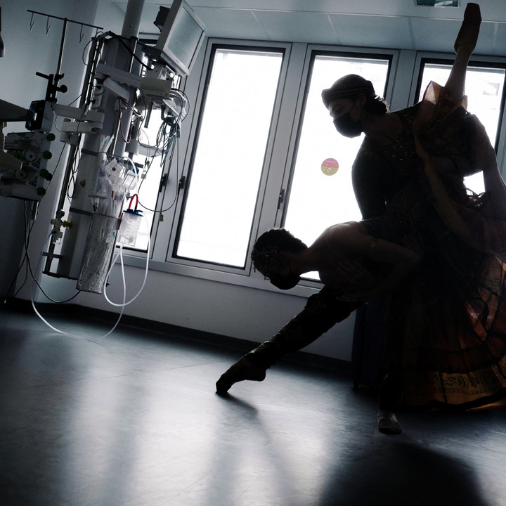 Dua penari balet Paris menari untuk anak-anak yang sakit di unit perawatan intensif anak di Hospital Necker-Enfants Malades AP-HP di Paris, Prancis.kumparanNEWS