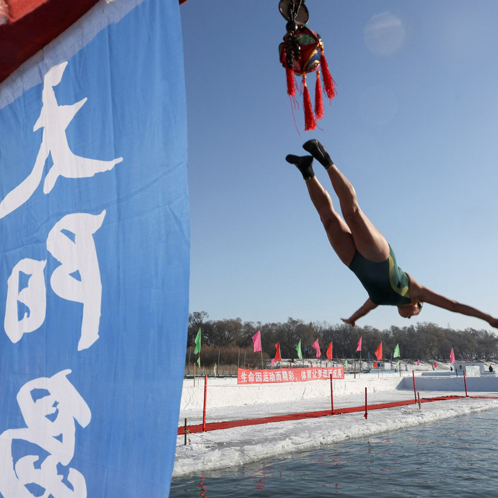 Para perenang terjun ke Sungai Songhua yang membeku di Harbin, China, Senin (5/1), saat suhu berkisar sekitar -15 derajat Celsius.