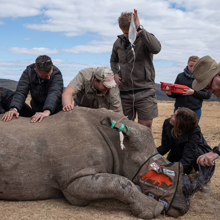 Seekor badak telah dibius untuk ditanami radioisotop dengan dosis yang telah dihitung ke dalam cula badak tersebut oleh profesor James Larkin dari Unit Radiasi dan Fisika Kesehatan (RHPU) University of the Witwatersrand bersama dengan anggota Proyek Rhisotop lainnya di sebuah lokasi yang dirahasiakan di cagar alam UNESCO Waterbury di Mokopane, Selasa (25/6).