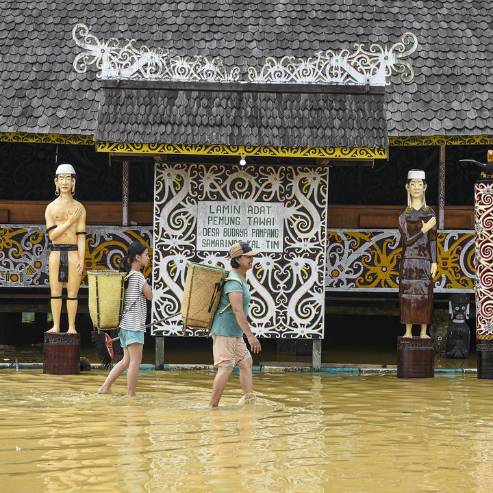 Warga berjalan melintasi banjir di halaman Lamin Adat Pemung Tawai, Desa Budaya Adat Pampang, Samarinda, Kalimantan Timur, Senin (27/1/2025).kumparanNEWS