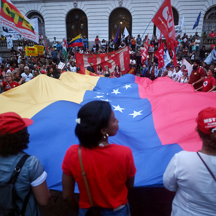 Sejumlah orang mengibarkan bendera Venezuela raksasa saat mereka berpartisipasi dalam demonstrasi mendukung Presiden Venezuela Nicolas Maduro di alun-alun Cinelandia di Rio de Janeiro, Brasil, Senin (5/1/2026) waktu setempat.