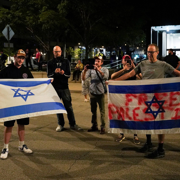 Pengunjuk rasa pro-Palestina melakukan aksi di depan konsulat Israel, Chicago, Amerika Serikat (AS), Selasa (20/8) waktu setempat. Unjuk rasa itu bersamaan dengan acara Konvensi Nasional Partai Demokrat yang berlangsung di Chicago.