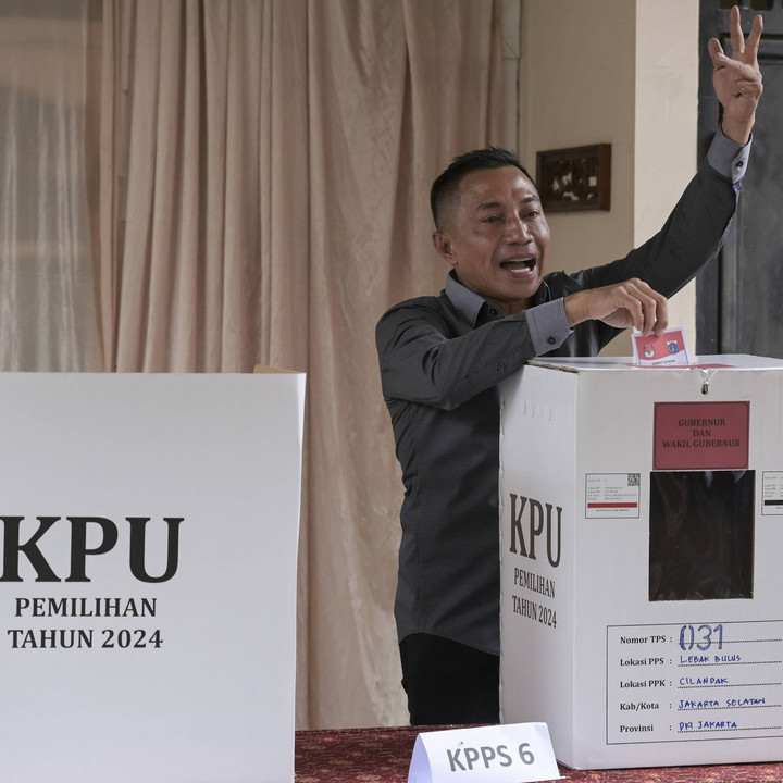 Calon Gubernur DKI Jakarta nomor urut 2 Dharma Pongrekun memasukkan kertas suara ke dalam kotak suara di TPS 31 Lebak Bulus, Jakarta Selatan, Rabu (27/11/2024).kumparanNEWS