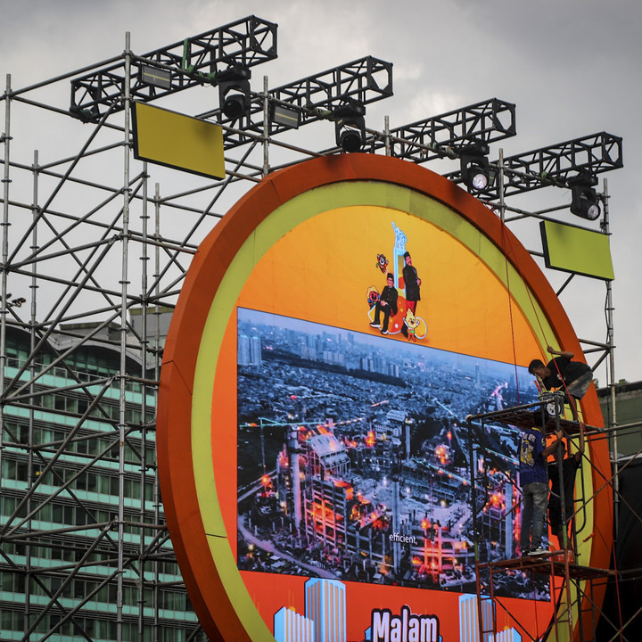 Tidak hanya itu, panggung utama acara nanti malam juga menjadi daya tarik bagi para warga yang melintas di kawasan tersebut, sesekali mereka berhenti sekaligus mendokumentasikan panggung yang berada di Monumen Bundaran HI.