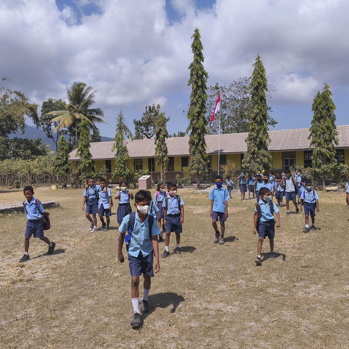 Sejumlah siswa SDK Boganatar berjalan pulang usai kegiatan belajar diliburkan akibat terdampak material abu vulkanik Gunung Lewotobi Laki-laki di Talibura, Kabupaten Sikka, NTT, Selasa (20/8/2025).