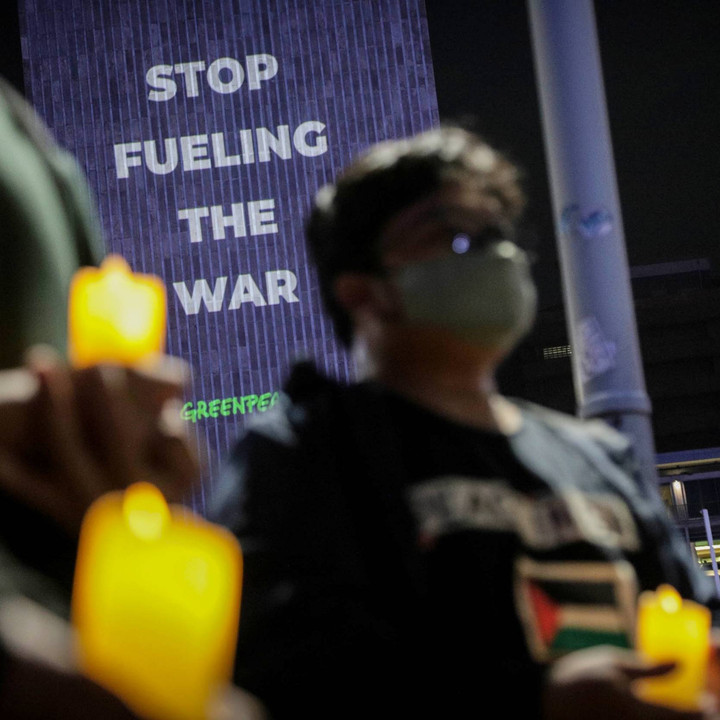 Sejumlah aktivis dari Greenpeace menggelar aksi solidaritas untuk Palestina di kawasan Bundaran HI, Jakarta, Jumat (3/11).kumparanNEWS
