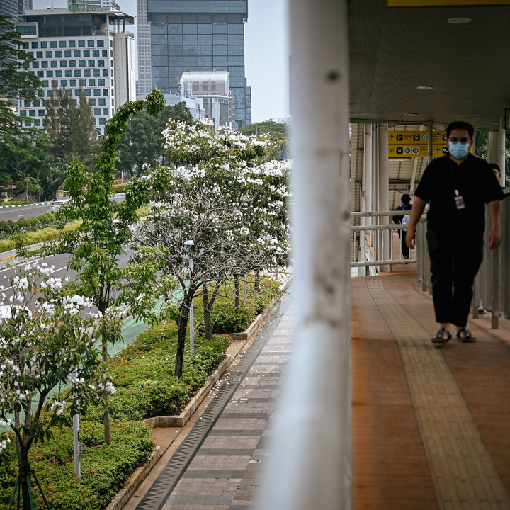 Bunga-bunga dari pohon Tabebuya yang ada di sejumlah ruas jalan di Jakarta mulai bermekaran. Bunga tersebut memiliki bentuk seperti bunga sakura dengan warna putih dan pink, membuat suasana baru yang indah seperti saat musim semi di Jepang.