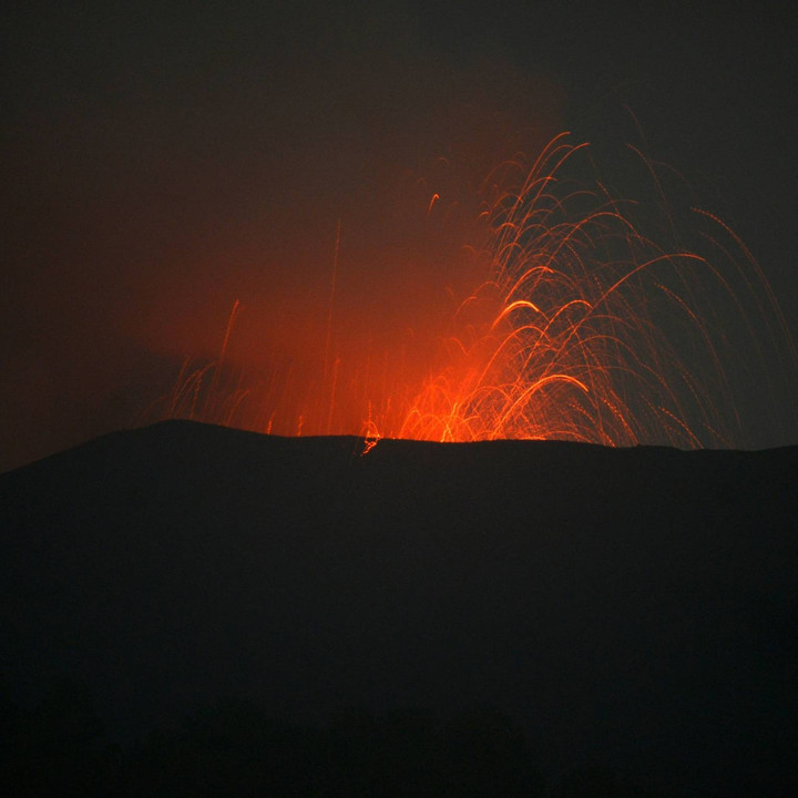Gunung Marapi terlihat mengeluarkan abu vulkanik dan batu pijar saat meletus terlihat dari Jorong Batang Silasiah, Nagari Bukik Batabuah, Agam, Sumatera Barat, Sabtu (24/2) dini hari.kumparanNEWS