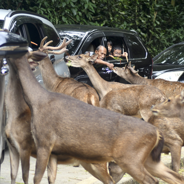 Wisatawan memberi makan rusa bawean (Axis kuhlii) saat Safari Journey di Taman Safari Indonesia (TSI), Cisarua, Kabupaten Bogor, Jawa Barat, Selasa (1/4/2025).kumparanNEWS