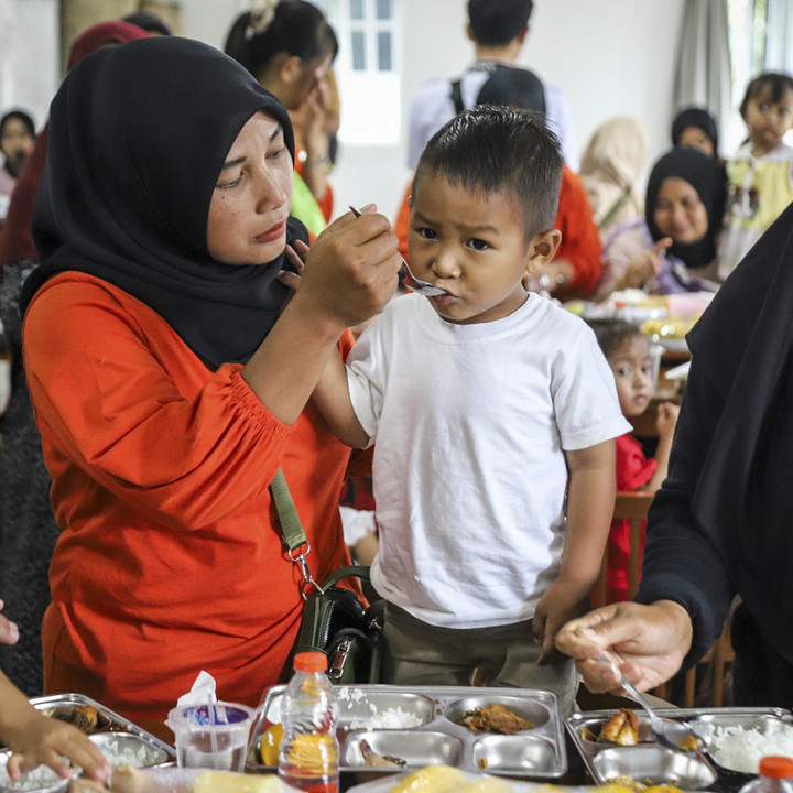 Sejumlah orang tua memberikan Makanan Bergizi Gratis (MBG) kepada anak-anak dalam kegiatan Cegah Stunting (Centing).kumparanNEWS