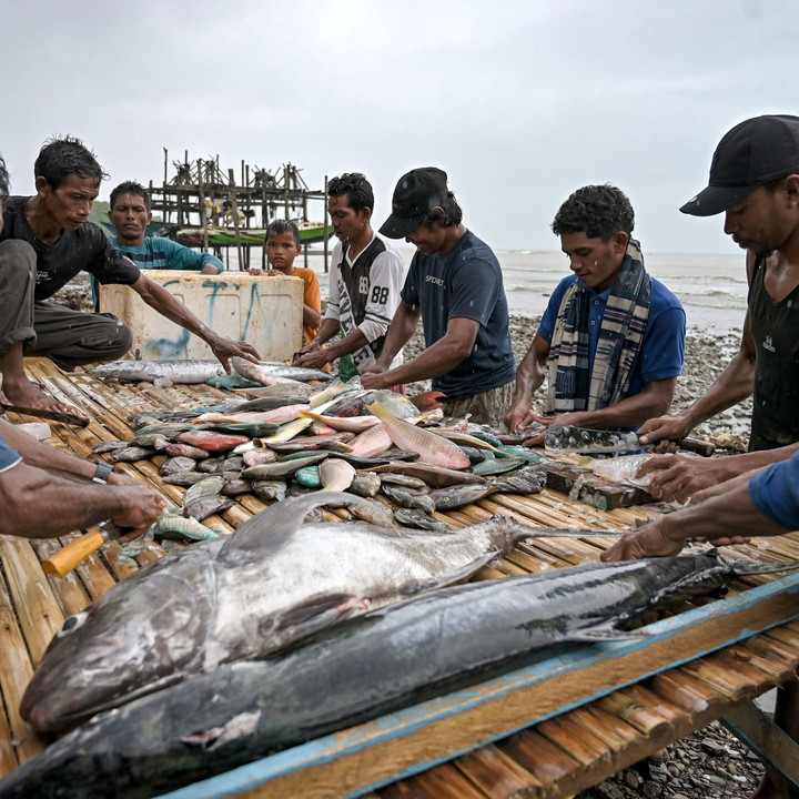 Mereka beramai-ramai berdiri sambil membersihkan ikan dengan berbagai ukuran di atas anyaman papan bambu.