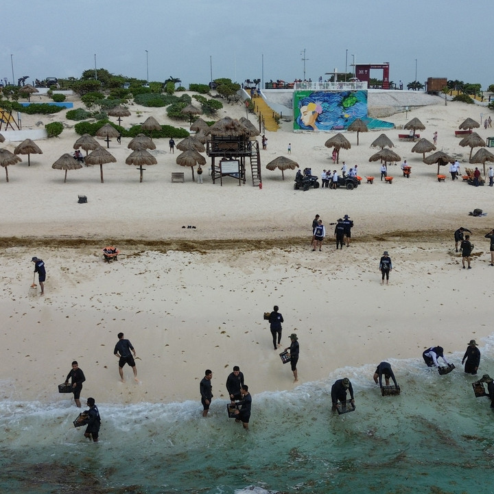 Foto: Kegiatan Massal Bersihkan Pantai dari Rumput Laut di Meksiko