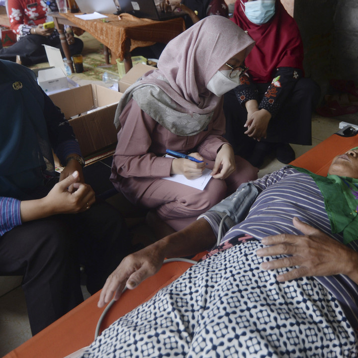 Petugas kesehatan memberi penanganan bagi warga di Posko penanganan kejadian luar biasa keracunan massal di Karangturi, Gantiwarno, Klaten, Jawa Tengah, Selasa (15/4/2025).kumparanNEWS