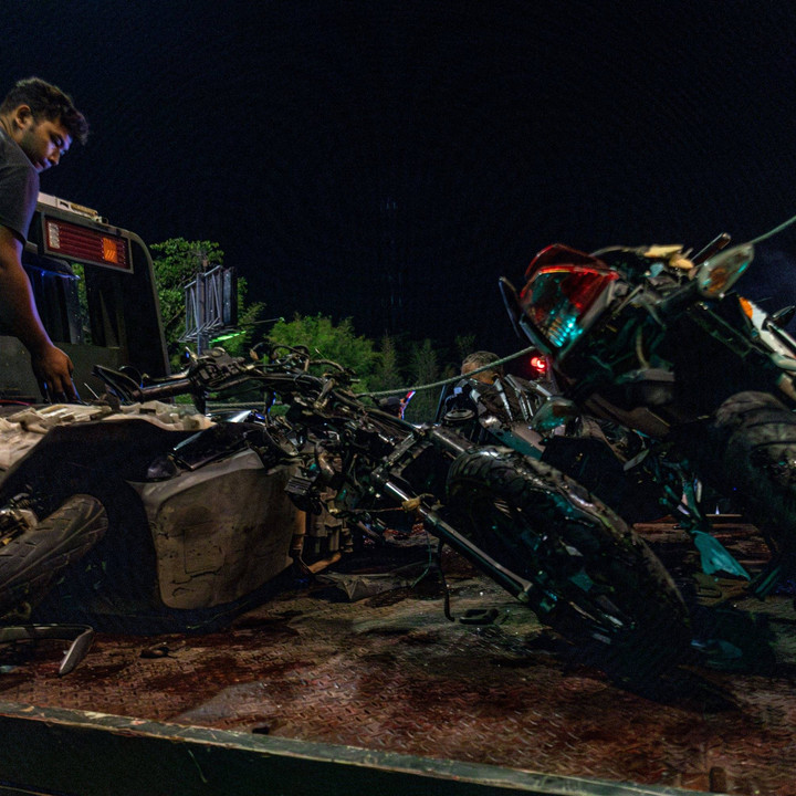 Petugas kepolisian dan relawan mengevakuasi kendaraan bermotor yang terlibat kecelakaan di simpang pintu keluar Tol Bawen, Kabupaten Semarang, Jawa Tengah, Sabtu (23/9) malam. kumparanNEWS