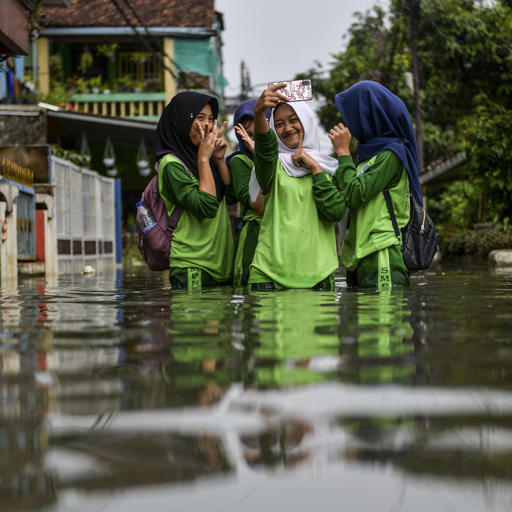 Siswi SMP melakukan swafoto saat melintasi banjir yang menggenangi permukiman di Kampung Bojongasih, Dayeuhkolot, Kabupaten Bandung, Jawa Barat, Jumat (16/5/2025).kumparanNEWS