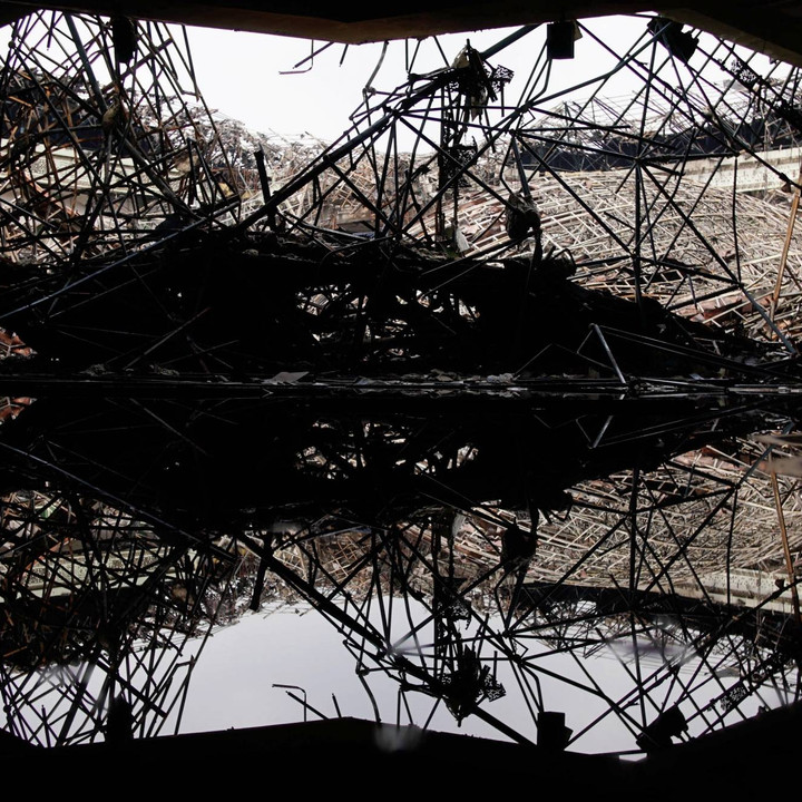 Kerangka kubah yang hangus dan puing-puing berserakan di dalam Masjid Jakarta Islamic Centre usai dilalap api kebakaran, Kamis (20/10).