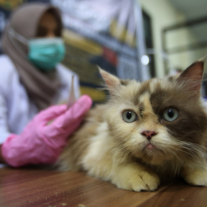 Dokter hewan mengukur suhu tubuh kucing saat berlangsung vaksinasi rabies gratis di Laboratorium Balai Karantina Aceh, Banda Aceh, Kamis (16/10/2025).