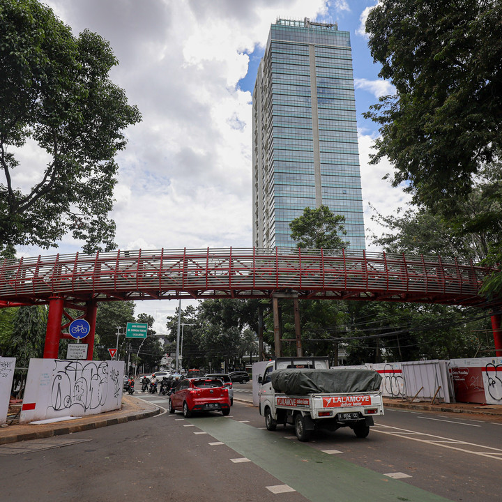 Pembangunan skybridge yang menghubungkan Taman Ayodya dan Taman Langsat di Kebayoran Baru, Jakarta Selatan, terus dikebut pengerjaannya pada Rabu (17/12).