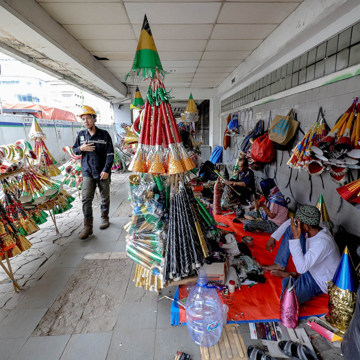 Deretan kios di Jalan Pintu Besar Selatan, Jakarta, Senin (29/12/2025), dipenuhi terompet warna-warni yang mencolok. Di depan kios-kios yang tutup, para pedagang terompet tampak sibuk merampungkan pembuatan terompet, menyambut malam pergantian tahun yang tinggal menghitung hari.