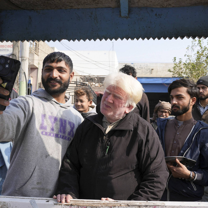 Saleem Bagga, yang dianggap oleh beberapa orang mirip dengan Presiden terpilih AS Donald Trump berpose selfie dengan seorang pelanggan di sebuah jalan di Sahiwal, Pakistan, Senin (13/1/2025).kumparanNEWS