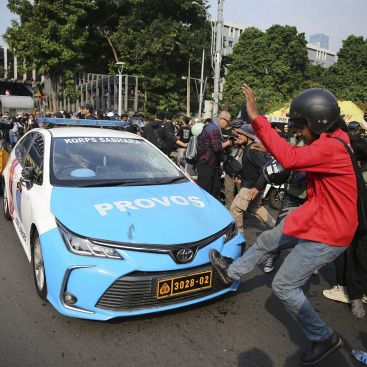 Demo di depan Polda Metro Jaya berujung ricuh pada Jumat (29/8). Sejumlah mobil polisi menjadi sasaran amukan massa. Massa melempari, memukul hingga memecahkan kaca tersebut.
