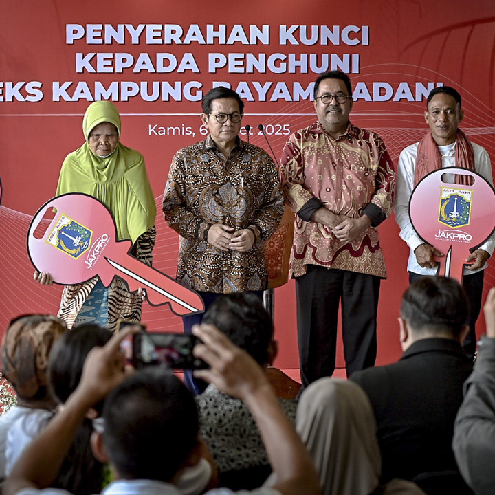 Gubernur DKI Jakarta Pramono Anung beserta wagub Rano Karno, melakukan penyerahan kunci Kampung Susun Bayam kepada perwakilan warga eks Kampung Bayam di Kampung Susun Bayam, Jakarta Utara, Kamis (6/3/2025).