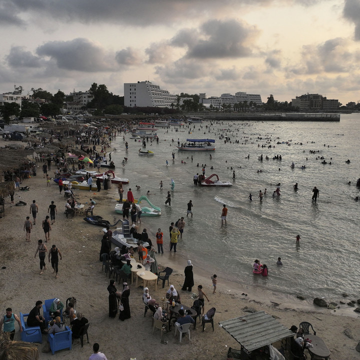 Foto udara orang-orang dari Latakia dan daerah lain di Suriah berkumpul di pantai di kota pesisir Mediterania, Latakia, Rabu (11/6/2025).kumparanNEWS