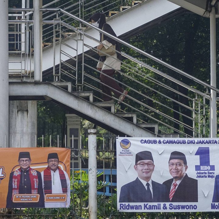 Warga berjalan melalui Jembatan Penyeberangan Orang (JPO) di dekat Alat Peraga Kampanye (APK) yang terpasang di Halte Flyover Jatinegara, Jakarta, Kamis (7/11/2024).kumparanNEWS
