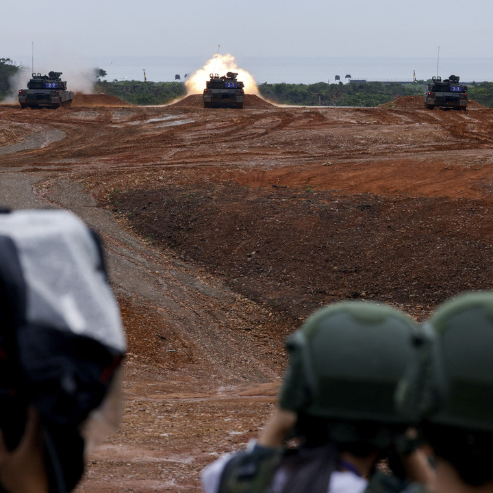 Empat tank Abrams diperlihatkan saat latihan militer di wilayah Hsinchu, Taiwan pada Kamis (10/7) waktu setempat.