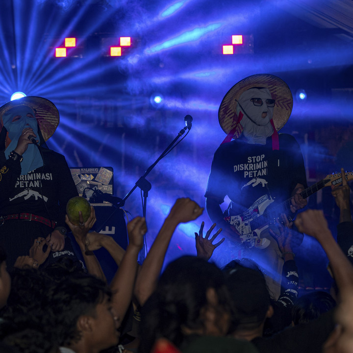 Penampilan Band Sukatani saat pementasan budaya bertajuk Nyawiji Bumi di lereng Pegunungan Kendeng, Desa Gadudero, Kecamatan Sukolilo, Kabupaten Pati, Jawa Tengah, Senin (21/4/2025).kumparanNEWS