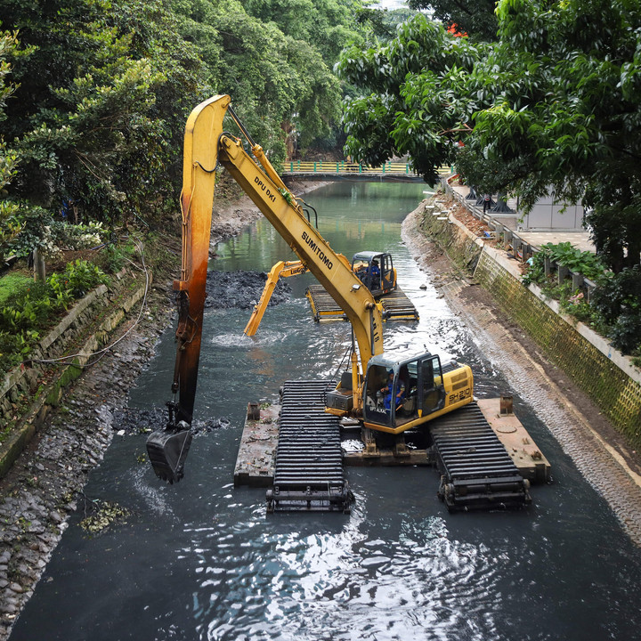 Proses pengerjaan mencakup pengangkatan sedimen lumpur dan material sampah yang mengendap di dasar sungai, sehingga aliran air dapat kembali lancar.kumparanNEWS