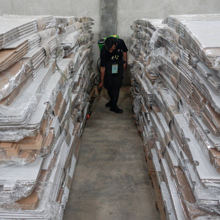 Petugas menyemprotkan cairan anti rayap di gudang KPU, Kabupaten Batang, Jawa Tengah, Senin (6/11). kumparanNEWS