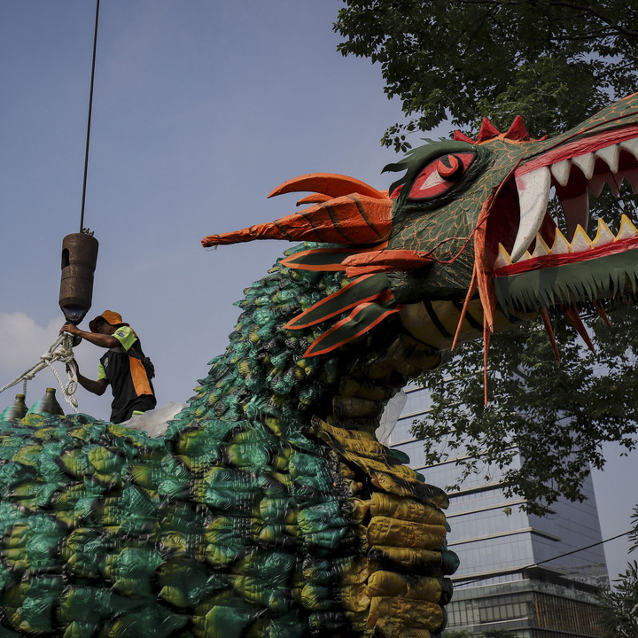 Petugas dari UPS Badan Air DLH Jakarta menurunkan perahu berbentuk naga di Bantaran Kali Ciliwung, Jakarta.kumparanNEWS