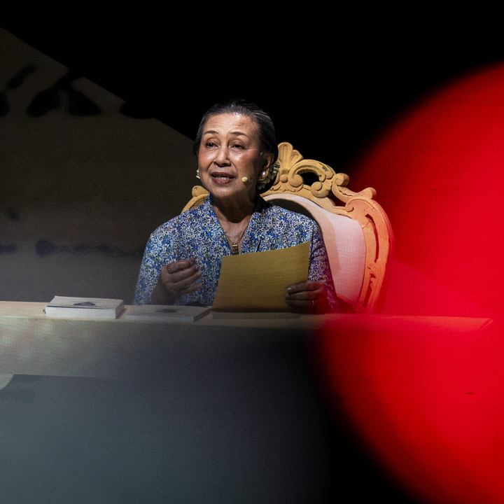 Seniman Ratna Riantiarno membacakan surat-surat asli Kartini saat Pementasan Terbitlah Terang di Museum Nasional Indonesia, Jakarta, Senin (21/4/2025).kumparanNEWS