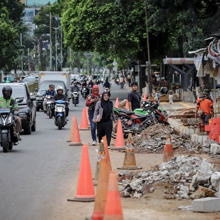 Pejalan kaki berjalan di tengah jalan raya di samping proyek galian di Jalan Dr. Soepomo, Jakarta, Rabu (12/11/2025).