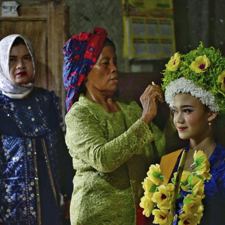 βPara cuwene tampil anggun mengenakan kebaya lengkap dengan mahkota bunga segar di kepala, sementara bujang mengenakan pakaian adat serba hitam dengan ikat kepala khas.
