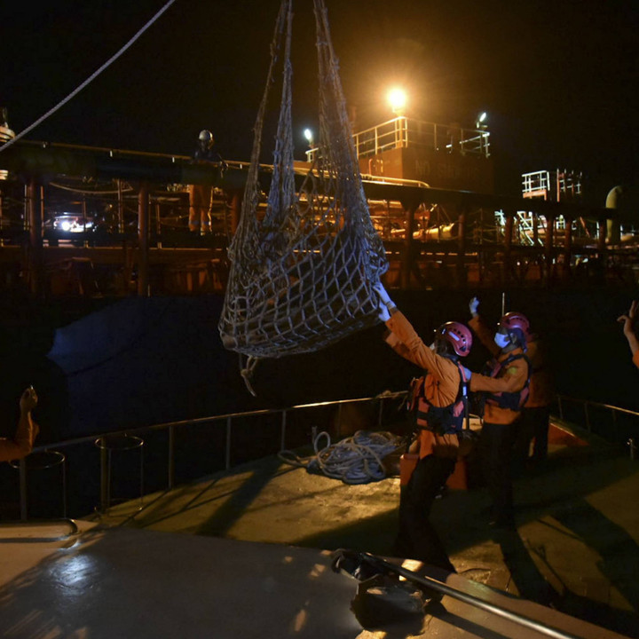 Anggota Basarnas mengevakuasi Tenaga Kerja Indonesia (TKI) menggunakan crane dari kapal tanker TTC Vishaka berbendera Panama ke kapal SAR Rescue Boat (RB) 203 di Selat Malaka, Sumatera UtarakumparanNEWS