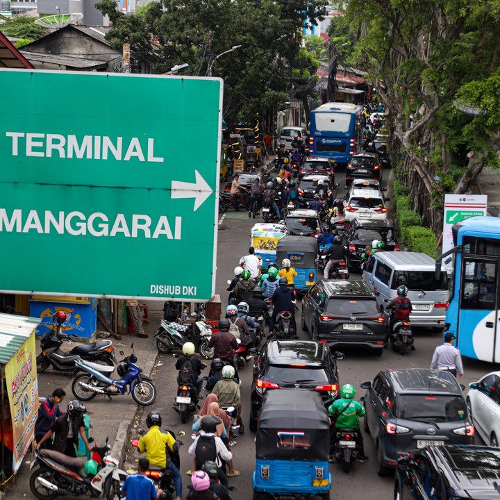 Sejumlah pengendara kendaraan bermotor tersendat saat melintas di kawasan Manggarai, Jakarta, Kamis (30/1).