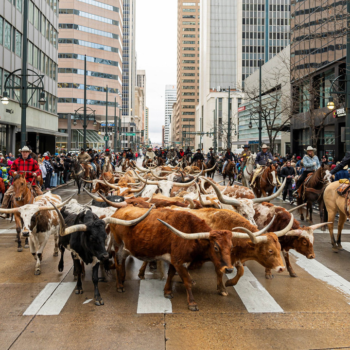 Sapi-sapi Longhorn digiring melewati pusat kota Denver selama parade pembukaan National Western Stock Show di Denver, Colorado, Amerika Serikat, Kamis (8/1/2026).