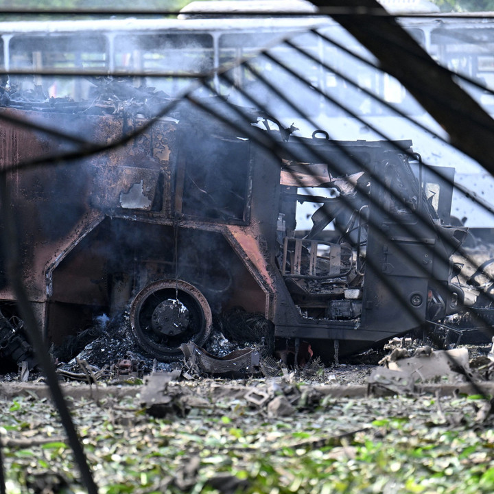Tampak kerusakan imbas serangan AS terlihat di pangkalan udara militer La Carlota di Caracas. Kendaraan Unit anti-pesawat dan bus yang berada di sekitar pangkalan udara tampak hancur.