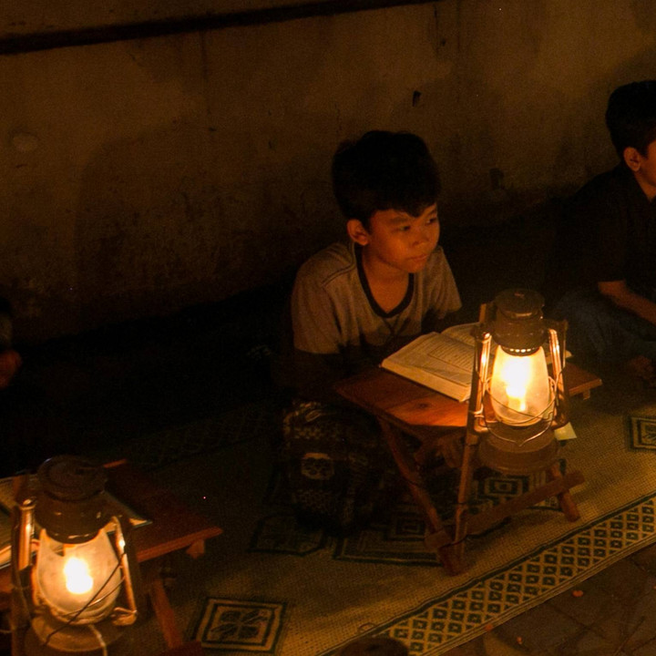Sejumlah anak mengaji dengan penerangan lampu lilin saat pengajian Tadarus Al Quran di kampung Prajurit Wirotamtomo, Baluwarti, Solo, Jawa Tengah, Rabu (3/4).kumparanNEWS
