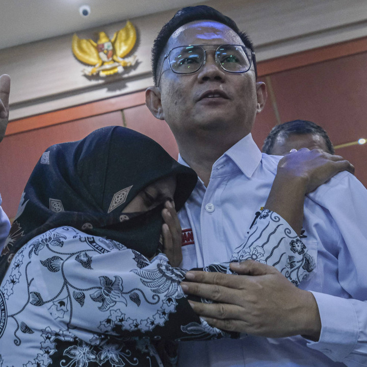 Guru honorer SDN 4 Baito Supriyani memeluk kuasa hukumnya Andri Darmawan usai divonis bebas di Pengadilan Negeri Andoolo, Konawe Selatan, Sulawesi Tenggara, Senin (25/11/2024).