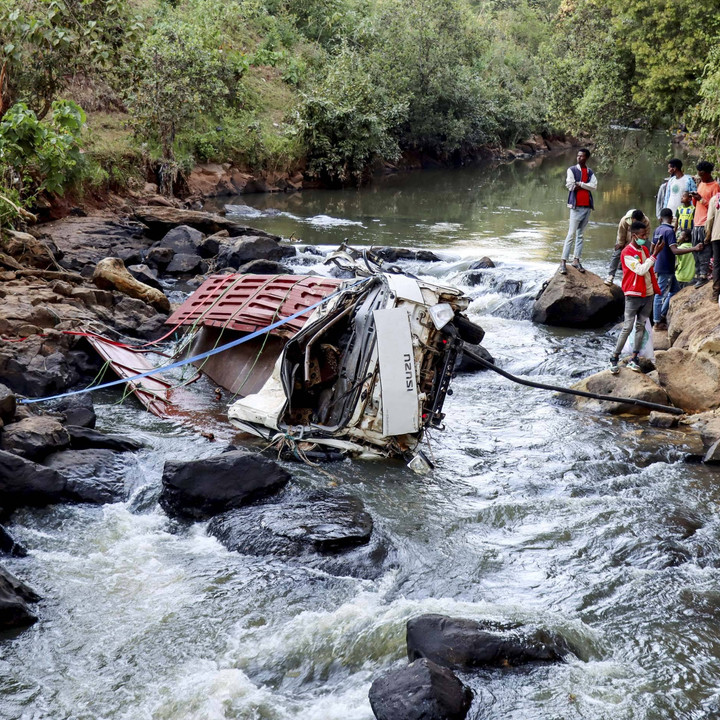 Orang-orang melihat sebuah truk yang jatuh dari Jembatan Gelan saat kembali dari sebuah upacara pernikahan di wilayah Sidama selatan, Ethiopia, Senin (30/12/2024).kumparanNEWS