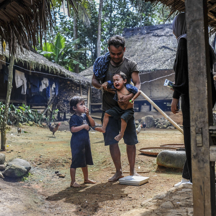 Seorang bapak Suku Badui membujuk anaknya untuk ditimbang sebelum diberikan vitamin A di Kampung Cisadane, Lebak, Banten, Minggu (16/2/2025).