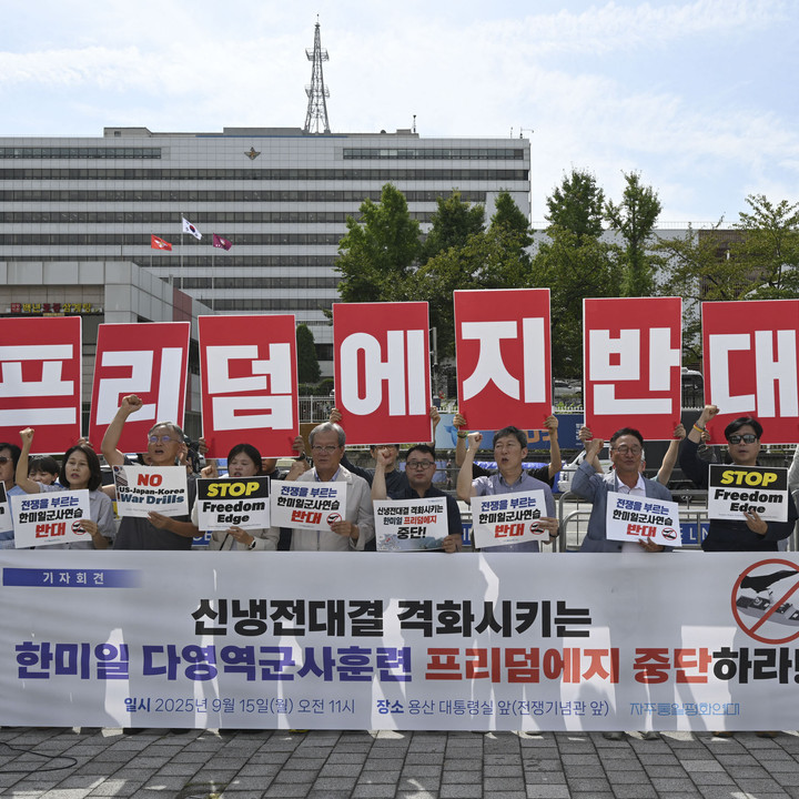 Para demonstran Korea Selatan memegang plakat bertuliskan "No Freedom Edge" dalam aksi protes di depan Kementerian Pertahanan, Korea Selatan, Senin (15/9/2025).