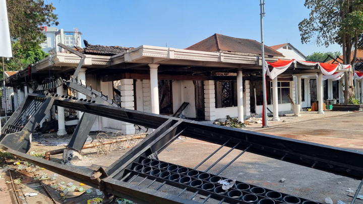 Gedung Grahadi Surabaya sisi kiri atau barat dibakar massa tak dikenal pada Sabtu malam (30/8). Terdapat sejumlah bangunan yang hangus terbakar.