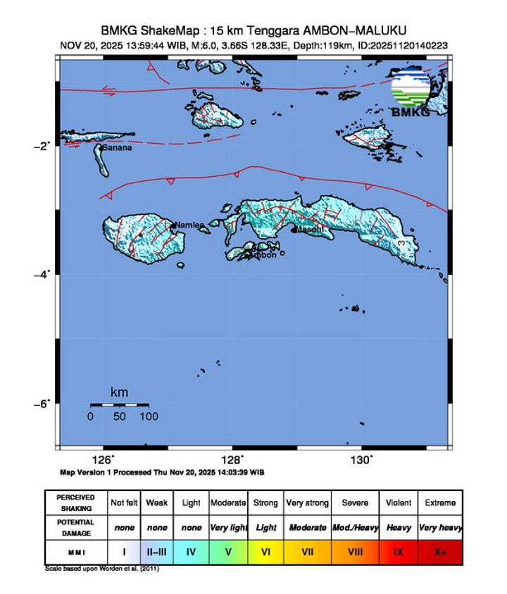 Gempabumi berkekuatan 6,0 magnitudo mengguncang wilayah Pulau Ambon dan sekitarnya, Kamis (20/11/2025) sekitar pukul 15: 59 WIT.