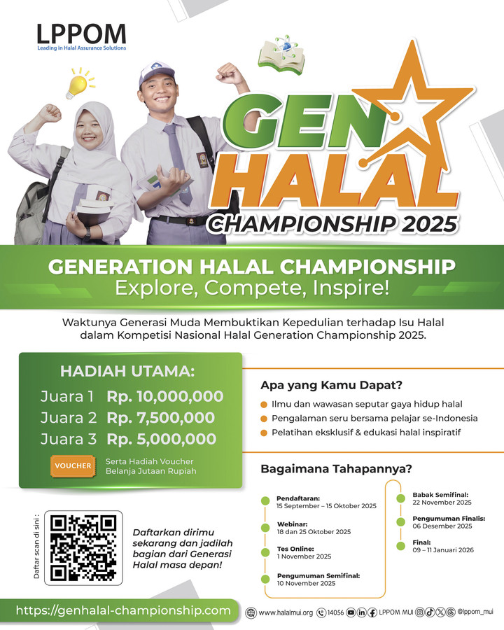 Generasi muda Indonesia, inilah saatnya! Melalui Gen Halal Championship 2025 by LPPOM, kamu bisa mengasah pengetahuan, kreativitas, dan karakter berlandaskan nilai halal, sekaligus membuka jalan menuju peran besar di panggung global. Gratis, bergengsi, dan penuh inspirasi. Apakah kamu siap?