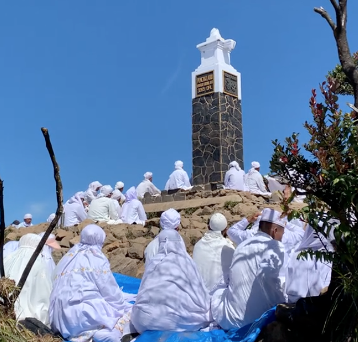 Sekelompok orang berpakaian serba putih duduk mengitari tugu di puncak Gunung Lawu. Tampak beberapa orang memakai serban putih dan beberapa yang lain mengenakan mukena.