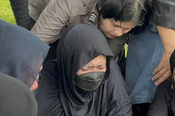 Arum tak kuasa menahan tangis, terutama setelah proses pemakaman dinyatakan selesai. Tangisannya terdengar jelas di sela-sela doa yang dipanjatkan para pelayat.